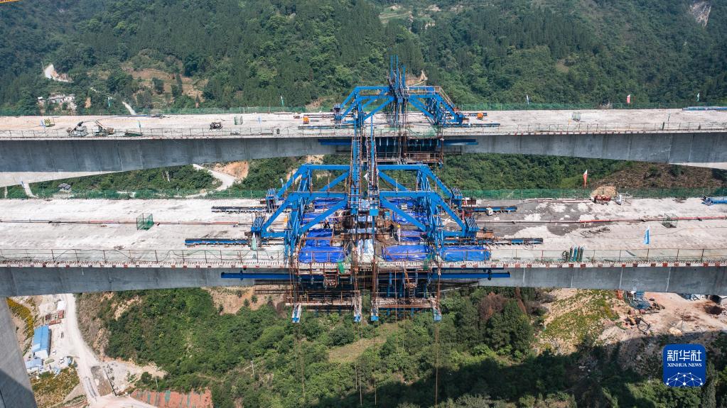 5月27日拍摄的贵金古高速清池特大桥主桥连续刚构合龙现场(无人机照片)。