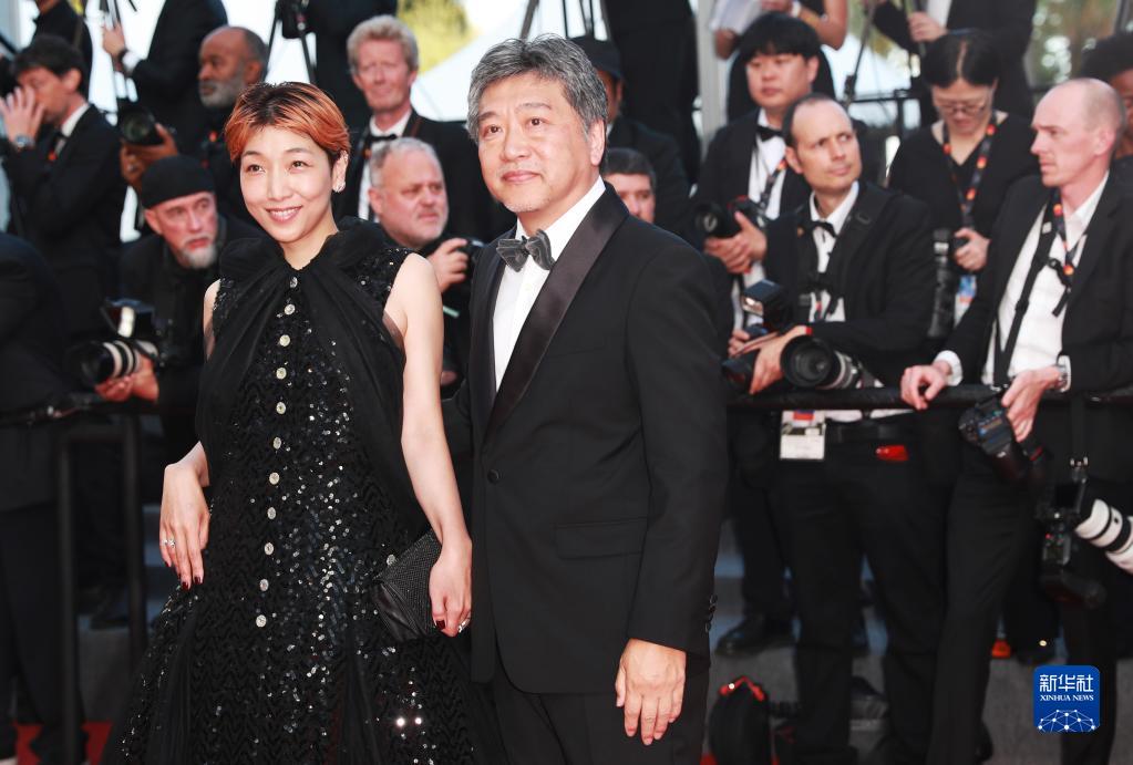 5月27日,日本影片《怪物》的导演是枝裕和(右)和演员安藤樱在法国戛纳国际电影节踏上闭幕式红毯。 第76届戛纳国际电影节27日在法国南部城市戛纳落下帷幕。 新华社记者 高静 摄