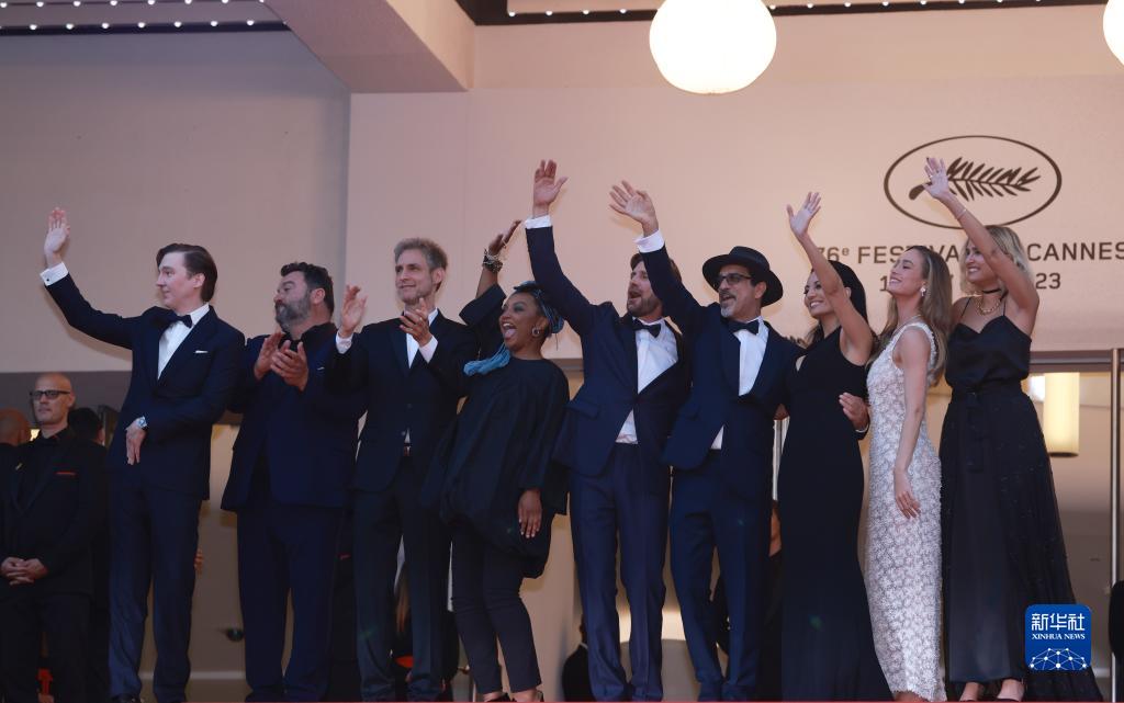 5月27日,在法国戛纳国际电影节上,主竞赛单元评委会主席、瑞典导演鲁本·奥斯特伦德(中)携众评委踏上闭幕式红毯。 第76届戛纳国际电影节27日在法国南部城市戛纳落下帷幕。 新华社记者 高静 摄