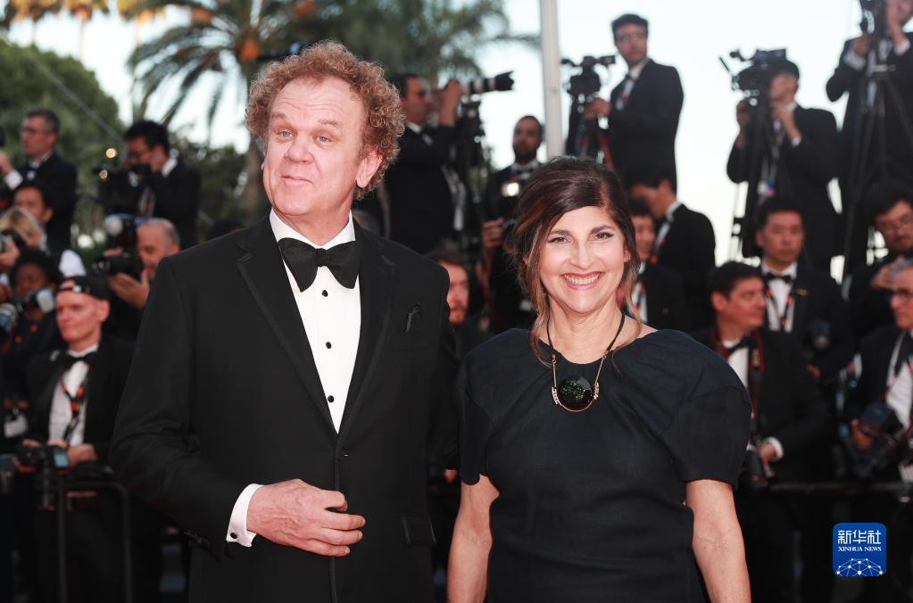 5月27日,在法国戛纳国际电影节上,“一种关注”单元评委会主席、美国演员约翰·克里斯托弗·赖利(左)踏上闭幕式红毯。 第76届戛纳国际电影节27日在法国南部城市戛纳落下帷幕。 新华社记者 高静 摄