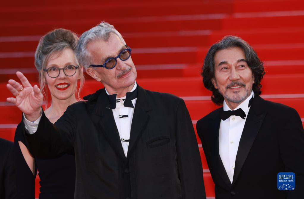 5月27日,在法国戛纳国际电影节上,影片《完美的日子》的导演维姆·文德斯(中)和主演、日本演员役所广司(右)踏上闭幕式红毯。 第76届戛纳国际电影节27日在法国南部城市戛纳落下帷幕。 新华社记者 高静 摄