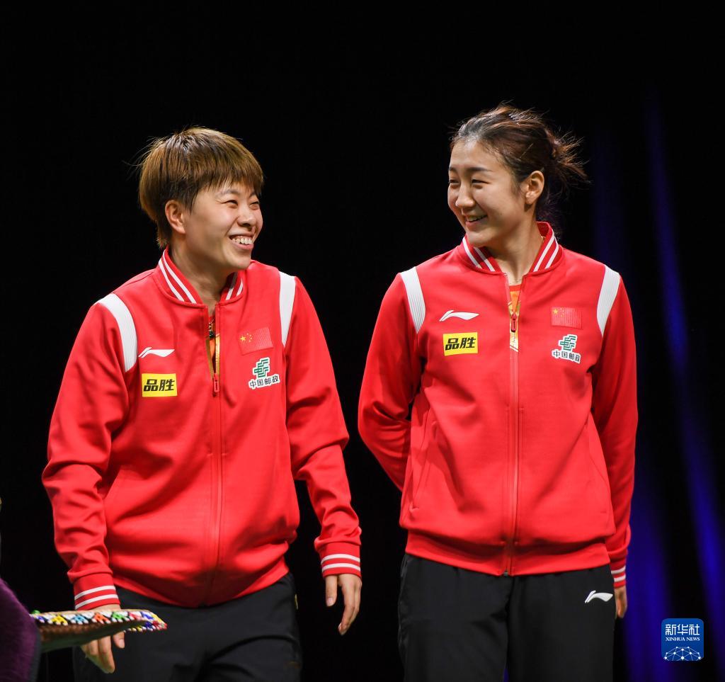当日,2023年世界乒乓球锦标赛女双颁奖仪式在南非德班举行。在女双决赛中,中国组合陈梦/王艺迪以3比0战胜韩国组合田志希/申裕斌,夺得冠军。
