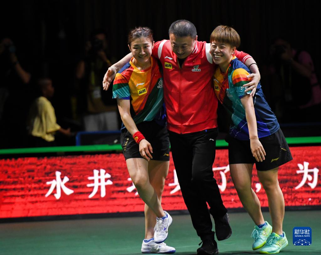 5月27日,陈梦(左)/王艺迪(右)与教练马琳庆祝胜利。