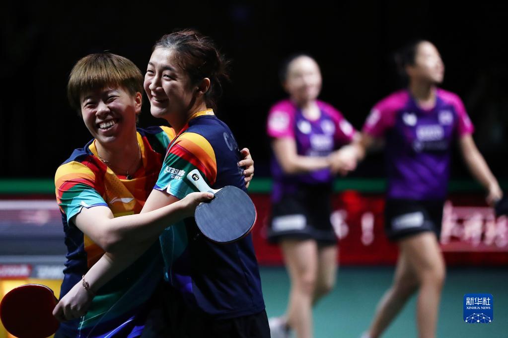 5月27日,陈梦/王艺迪(左)赛后拥抱庆祝。