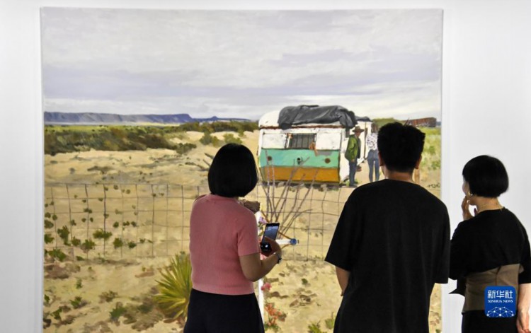 5月28日,市民在国家对外文化贸易基地(北京)的意大利MDC画廊观看展出的油画作品。