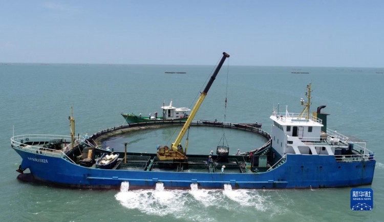 5月27日,在湛江市徐闻县西连镇,渔业工人从徐闻国桥深海养殖有限公司的金鲳鱼深海网箱捕鱼(无人机照片)。