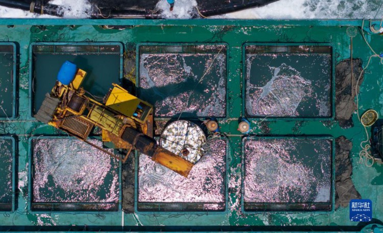 5月27日,在湛江市徐闻县西连镇,渔业工人从徐闻国桥深海养殖有限公司的金鲳鱼深海网箱捕鱼(无人机照片)。 广东省湛江市是全国最大的金鲳鱼养殖基地之一,被誉为“中国金鲳鱼之都”。在深蓝色海面上,整齐分布着一串串100米左右周长的深海网箱,孕育着被誉为“黄金鱼”的金鲳鱼,年产量约10万吨,约占全国产量三到四成,除了供应中国市场,还出口到美国、印度、马来西亚等国家和地区。随着近年金鲳鱼深海养殖规模化、集群化、市场化步伐加快,小小“黄金鱼”每年可创造百亿元产值。 新华社记者 卢汉欣 摄
