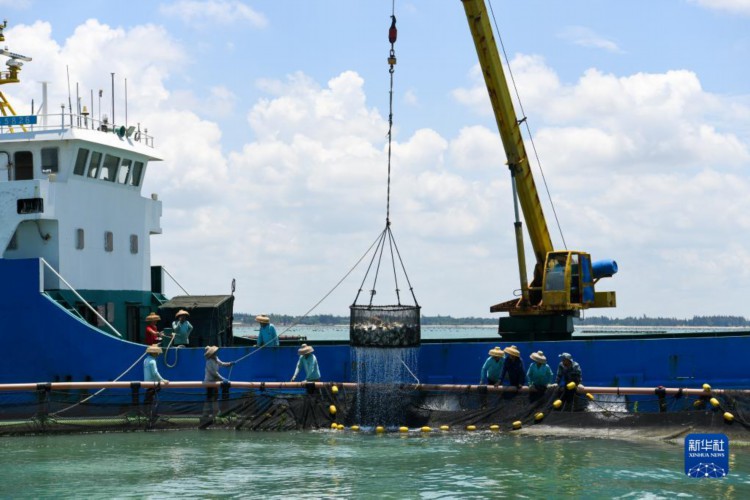 5月27日,在湛江市徐闻县西连镇,渔业工人将从深海网箱中打捞出的金鲳鱼放入运输船(无人机照片)。 新华社记者 毛思倩 摄