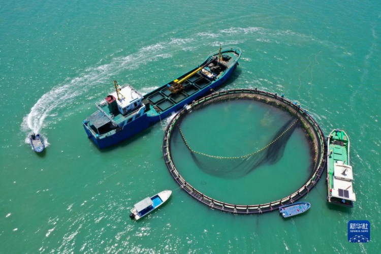 5月27日,在湛江市徐闻县西连镇,渔业工人在深海网箱拉网收获金鲳鱼(无人机照片)。