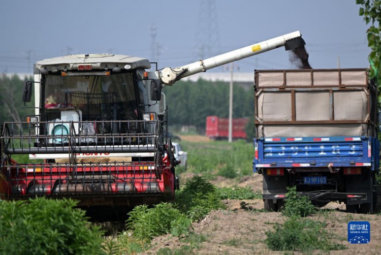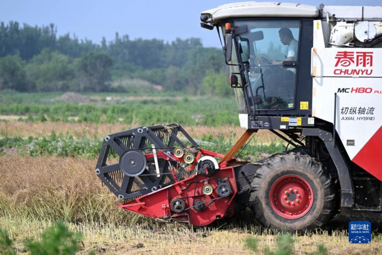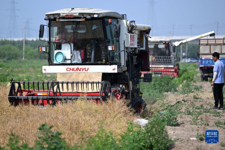 当日,天津市北辰区大张庄镇田庄村的1100亩油菜田,开始集中收割菜籽。联合收割机将在三天内完成采收,为下一轮种植高粱留出时间。