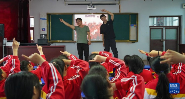 5月30日,在安达市任民镇中心小学,音乐老师李平(右)和张雨在教室内指导音乐班的孩子们练习唱歌。