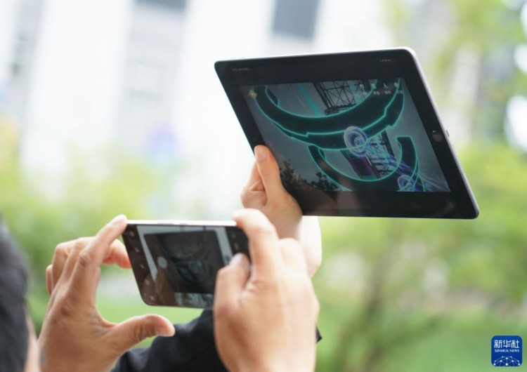 5月30日,工作人员在科幻产业新技术新产品展现场进行AR(增强现实)效果展示。