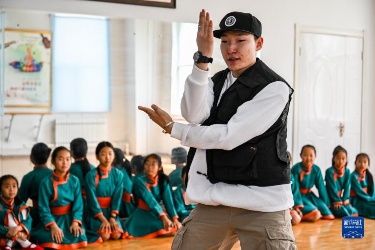 5月31日,苏尼特右旗乌兰牧骑队员为“小小乌兰牧骑”队员表演街舞。