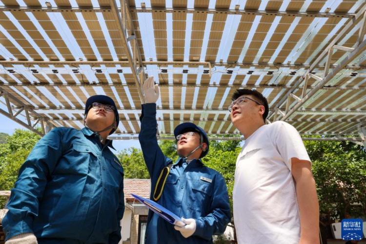 5月31日,沂源县供电公司技术人员在燕崖镇朱家户村为使用能源自平衡技术的民宿检查光伏发电板。