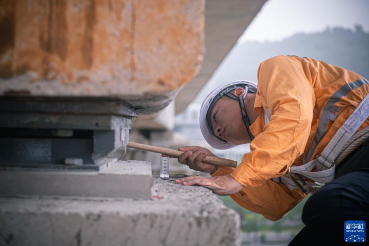 6月1日,宁波工务段金甬铁路提前介入组的工人对新昌江特大桥箱梁进行检测。