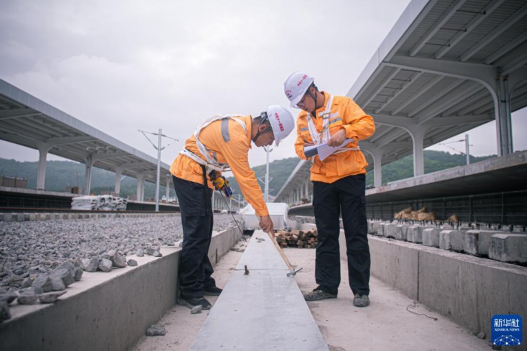 6月1日,宁波工务段金甬铁路提前介入组的工人对建设中的嵊州站车站附属设施进行检测。