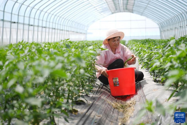 6月1日,河北雄安新区安新县阳雀湖西里现代农业产业园区工人在采摘辣椒。