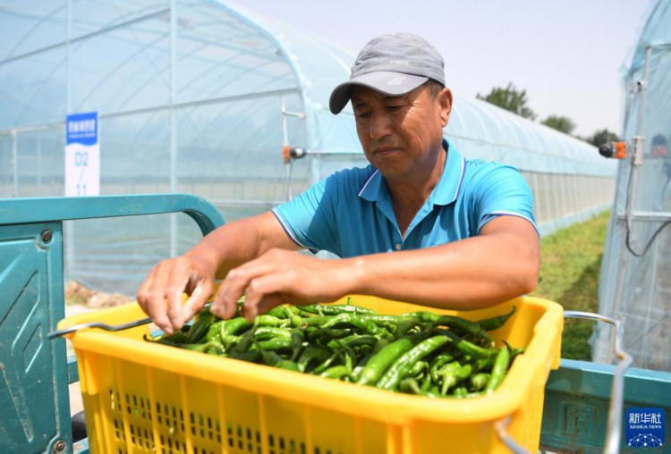 6月1日,河北雄安新区安新县阳雀湖西里现代农业产业园区工人在采摘辣椒。 2022年7月,河北雄安新区安新县安新镇西里街村与湖南省阳雀湖农业开发有限公司签约“阳雀湖辣椒”项目,进行“南椒北移”,打造辣椒种植基地。目前,“南椒北移”获得成功,通过订单种植的辣椒不断供应市场。 新华社记者 朱旭东 摄