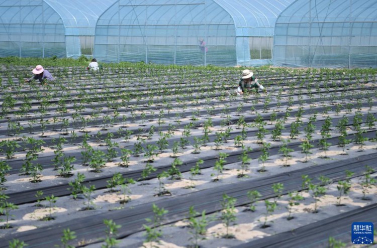 6月1日,河北雄安新区安新县阳雀湖西里现代农业产业园区工人在管护辣椒秧苗。 2022年7月,河北雄安新区安新县安新镇西里街村与湖南省阳雀湖农业开发有限公司签约“阳雀湖辣椒”项目,进行“南椒北移”,打造辣椒种植基地。目前,“南椒北移”获得成功,通过订单种植的辣椒不断供应市场。 新华社记者 朱旭东 摄