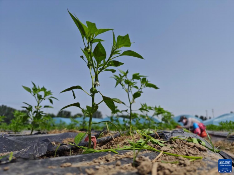6月1日,河北雄安新区安新县阳雀湖西里现代农业产业园区工人在管护辣椒秧苗。