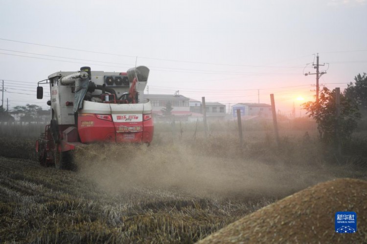 6月1日,在河南省驻马店市上蔡县邵店镇后杨村,收割机在抢收小麦。新华社记者 刘振坤 摄