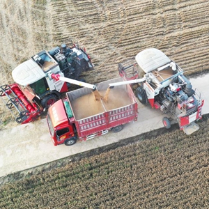 6月1日,在河南省驻马店市上蔡县邵店镇后杨村,收割机将收获的小麦装车(无人机照片)。 当日,在河南省驻马店市上蔡县,当地抓住晴好天气抢收小麦。新华社记者 张浩然 摄