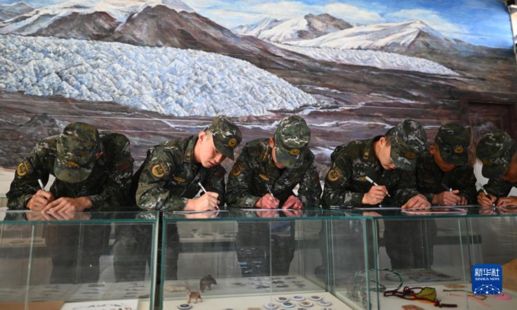 6月4日,武警青海总队海西支队官兵在“长江1号”邮局内写明信片,为家人送去来自长江源头的祝福。 当日,在青海省海西蒙古族藏族自治州格尔木市唐古拉山镇,武警青海总队海西支队官兵在长江源沱沱河开展“守卫长江源”主题党日活动。 新华社记者 张宏祥 摄 |