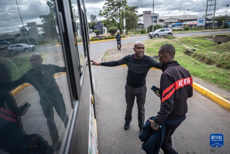 6月3日,在肯尼亚内罗毕,肯尼亚电动巴士公司检票员招揽乘客上车。