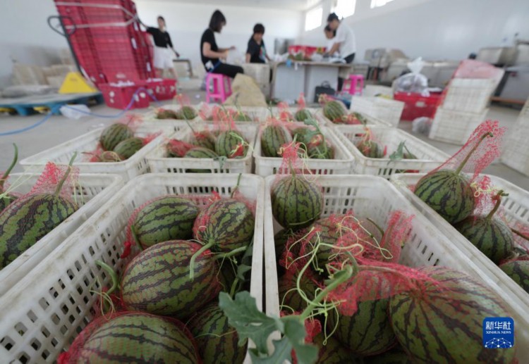 6月5日,卢龙县木井镇一家西瓜种植合作社的社员在将收获的西瓜包装。 近年来,河北省秦皇岛市卢龙县持续推进农业产业结构调整,引导农民因地制宜发展特色设施农业,种植高品质西瓜、葡萄、软枣猕猴桃等水果,促进农民增收,助力乡村振兴。 新华社记者 杨世尧 摄