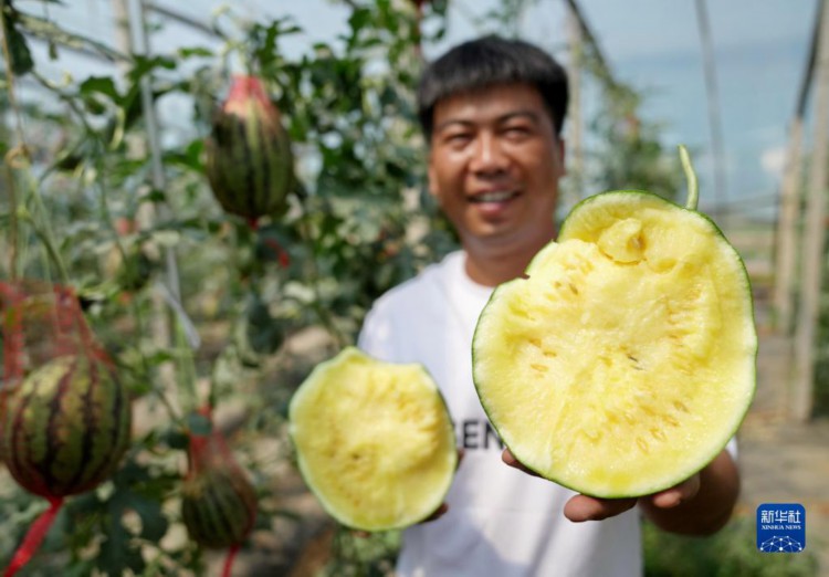 6月5日,卢龙县木井镇一家西瓜种植合作社的社员在展示收获的西瓜。 近年来,河北省秦皇岛市卢龙县持续推进农业产业结构调整,引导农民因地制宜发展特色设施农业,种植高品质西瓜、葡萄、软枣猕猴桃等水果,促进农民增收,助力乡村振兴。 新华社记者 杨世尧 摄
