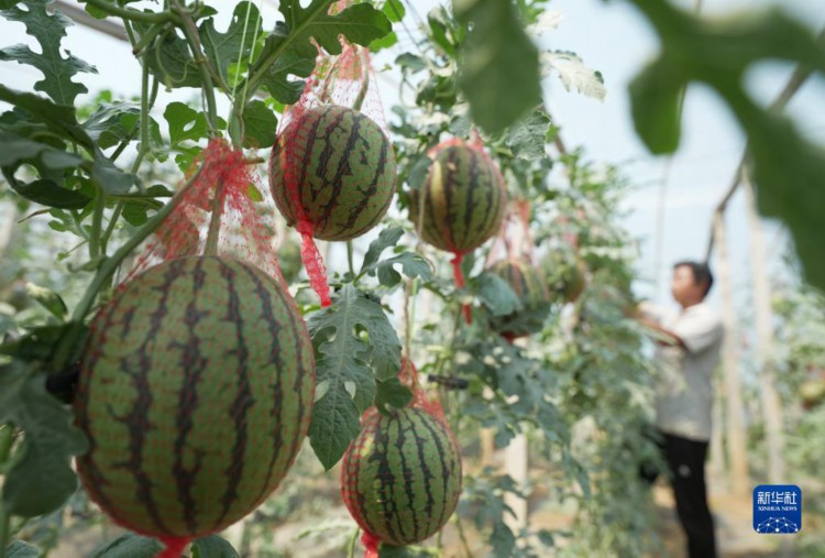 6月5日,卢龙县木井镇一家西瓜种植合作社的社员在大棚内管护西瓜。 近年来,河北省秦皇岛市卢龙县持续推进农业产业结构调整,引导农民因地制宜发展特色设施农业,种植高品质西瓜、葡萄、软枣猕猴桃等水果,促进农民增收,助力乡村振兴。 新华社记者 杨世尧 摄