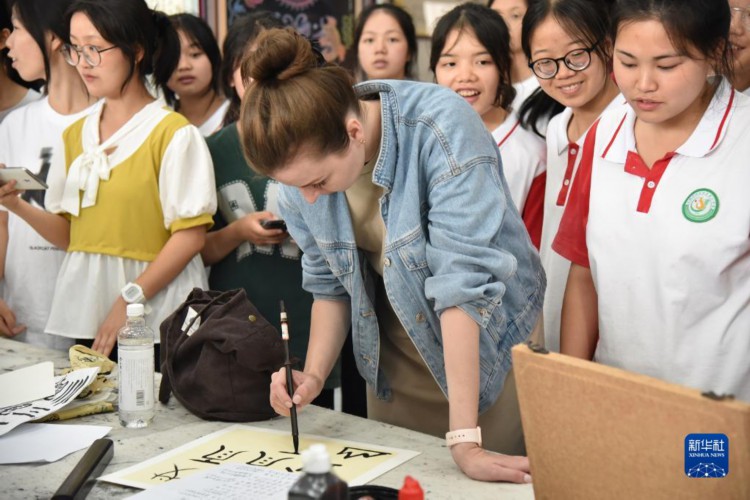 6月5日,参加三都高级中学第一届国际文化节的来华留学生学习书写水族文字。 近日,“邂逅中国”来华留学生社会实践活动在贵州举行。6月5日,来自突尼斯、巴基斯坦、老挝、巴西、印度尼西亚等国家的20名来华留学生来到贵州省黔南布依族苗族自治州三都水族自治县的三都高级中学,和学生们一起参加该校举行的第一届国际文化节。 新华社记者 骆飞 摄