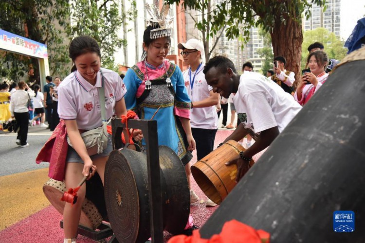 6月5日,参加三都高级中学第一届国际文化节的来华留学生体验敲击铜鼓。 近日,“邂逅中国”来华留学生社会实践活动在贵州举行。6月5日,来自突尼斯、巴基斯坦、老挝、巴西、印度尼西亚等国家的20名来华留学生来到贵州省黔南布依族苗族自治州三都水族自治县的三都高级中学,和学生们一起参加该校举行的第一届国际文化节。 新华社记者 骆飞 摄 |