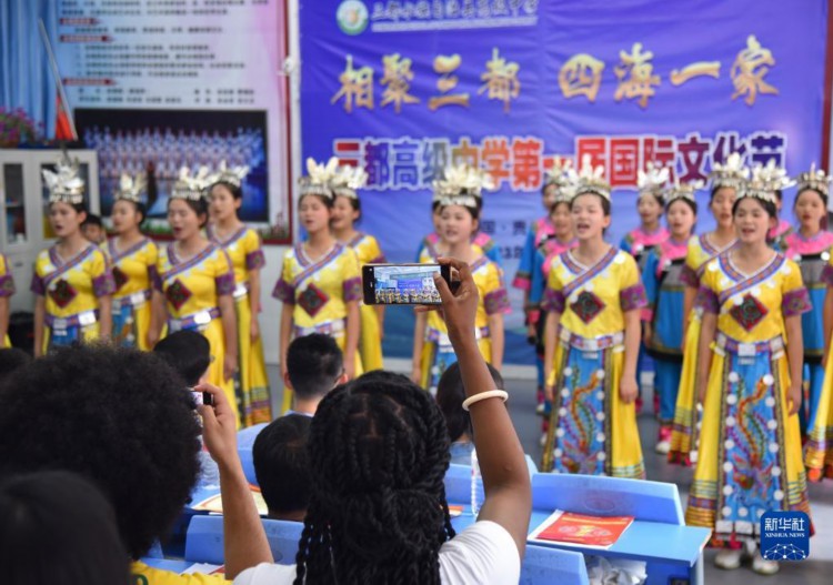 6月5日,来华留学生观看三都高级中学学生演唱的水族语言歌曲《水歌》。 近日,“邂逅中国”来华留学生社会实践活动在贵州举行。6月5日,来自突尼斯、巴基斯坦、老挝、巴西、印度尼西亚等国家的20名来华留学生来到贵州省黔南布依族苗族自治州三都水族自治县的三都高级中学,和学生们一起参加该校举行的第一届国际文化节。