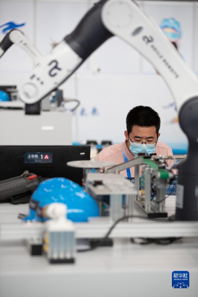 6月6日,选手在进行工业机器人系统操作员项目比赛。