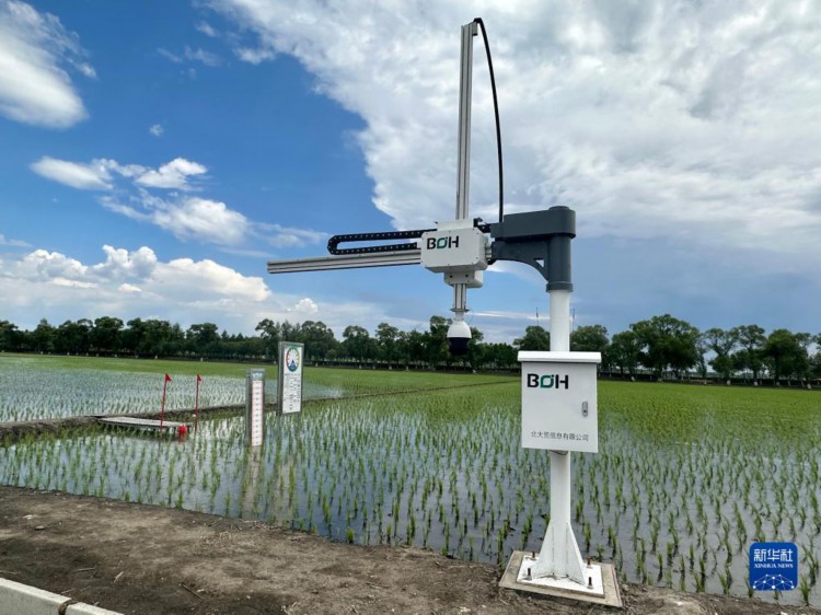6月5日在北大荒集团黑龙江闫家岗农场有限公司的一处稻田拍摄的叶龄诊断仪。 新华社记者 戴锦镕 摄