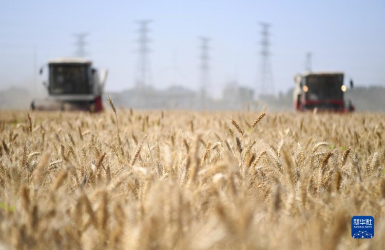 6月6日,在河南省安阳市滑县万古镇,收割机在抢收种子田的小麦。