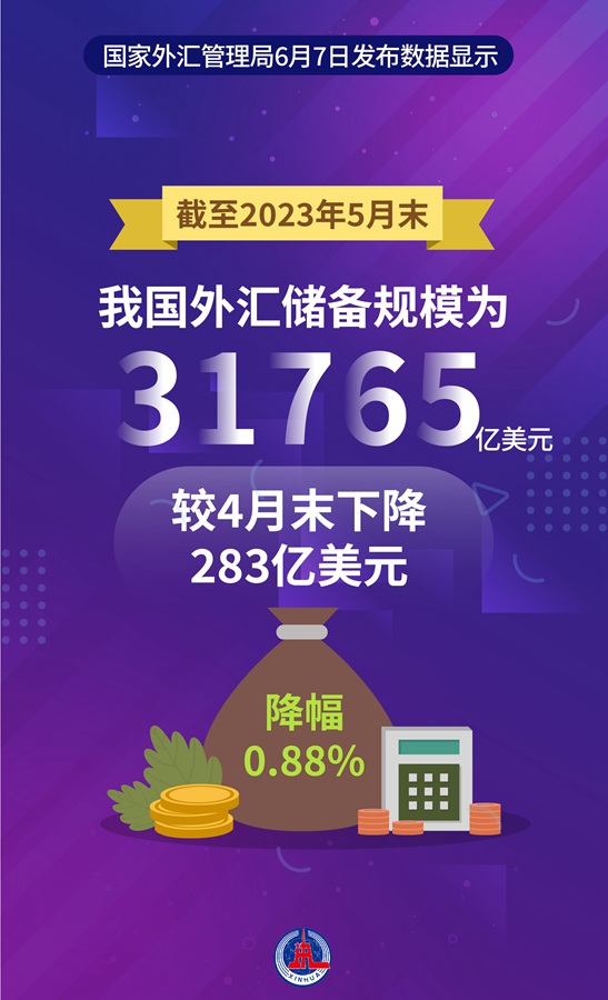 新华社北京6月7日电(记者刘开雄)国家外汇管理局7日发布数据显示,截至2023年5月末,我国外汇储备规模为31765亿美元,较4月末下降283亿美元,降幅为0.88%。