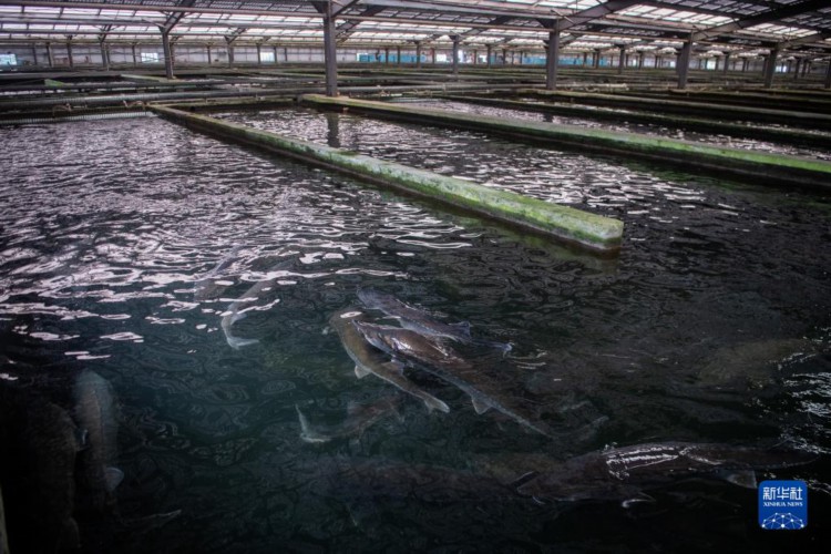 6月7日在中国清江(宜都)鲟鱼谷养殖车间拍摄的鲟鱼。