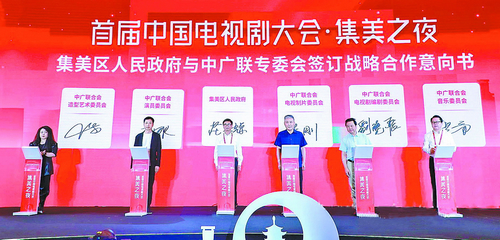 6月5日晚上,首届中国电视剧大会·集美之夜在集美湖豪生大酒店隆重举行。集美区与中国广播电视社会组织联合会各专委会签订战略合作意向书。未来,中广联电视制片委员会、电视剧编剧委员会、演员委员会、音乐委员会、造型艺术委员会等专委会将全力支持集美影视产业发展,在集美建立影视创作基地,开展创作、研讨、论坛、培训等活动,在推动集美影视创作同时,也服务全国影视产业发展。