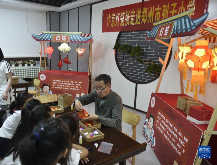 6月8日,学生们在活动现场观看非遗项目“汴京灯笼张”的彩灯制作技艺。