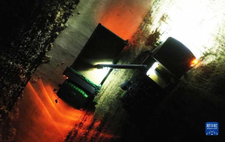6月7日晚,收割机将收获的小麦装车(无人机照片)。