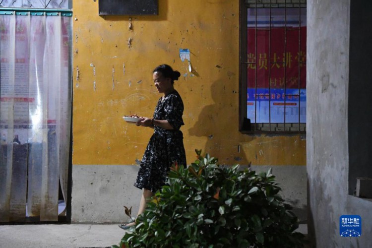 6月7日晚,村支部书记吴东星的妻子为抢收麦子的人们端菜。