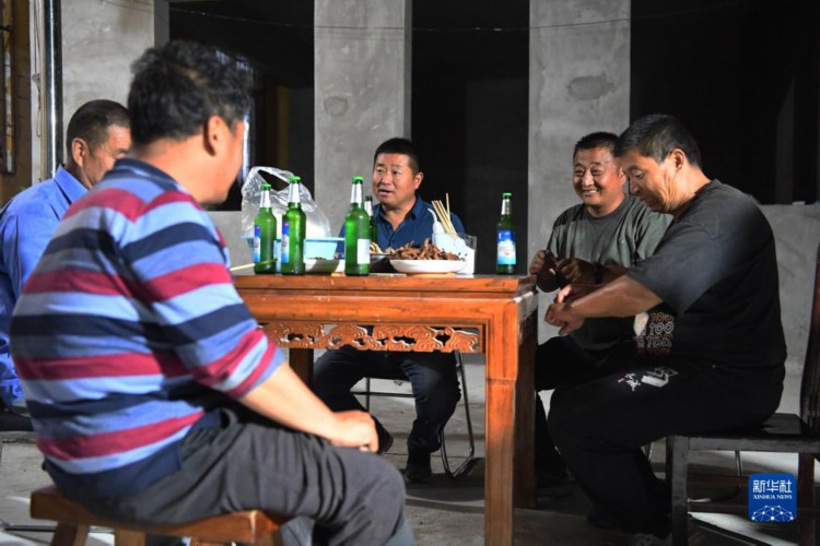 6月7日晚,村支部书记吴东星(右二)和农机手、抢收队员一起吃饭。