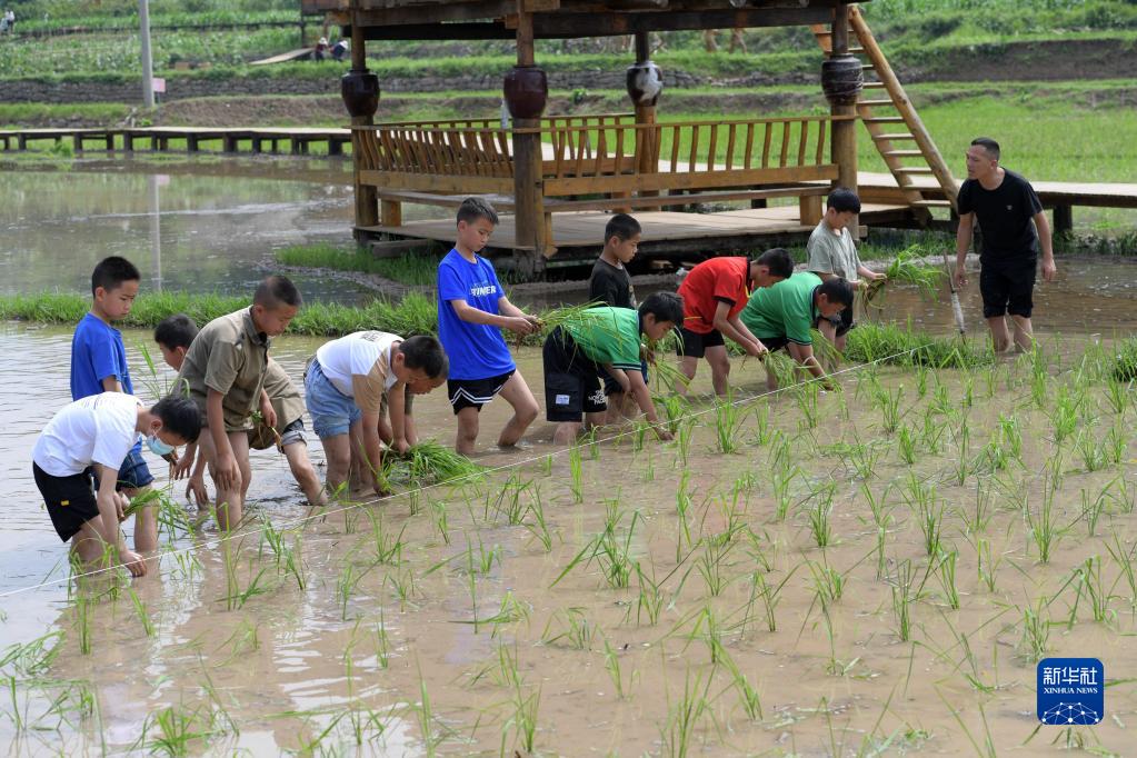 6月9日,学生在贵州省绥阳县中小学劳动教育综合实践基地体验插秧。 当日,200余名学生来到贵州省绥阳县中小学劳动教育综合实践基地,在基地老师的引导下参观农耕文化教育馆,体验插秧、播种等,感受劳动的乐趣。 近年来,绥阳县将劳动教育理念融入教学全过程,高标准打造学生劳动教育实践基地,引导学生树立正确的价值观,不断增强学生的劳动技能和创新能力。 目前,该基地已初步建起感受体验、技能习得等劳动教育课程体系,2022年9月开园至今,已接待各地中小学生10000余人次。 新华社记者 杨楹 摄