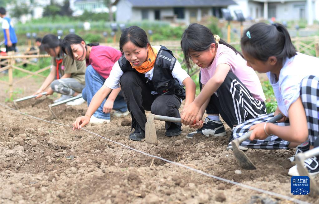 6月9日,学生在贵州省绥阳县中小学劳动教育综合实践基地学习种植白菜。