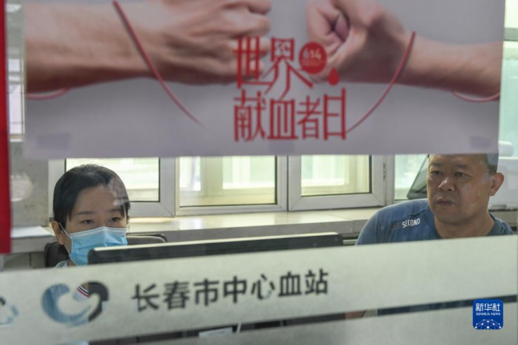 6月13日,在长春市中心血站,RH阴性血无偿献血志愿者王文东(右)在献血前检查身体。