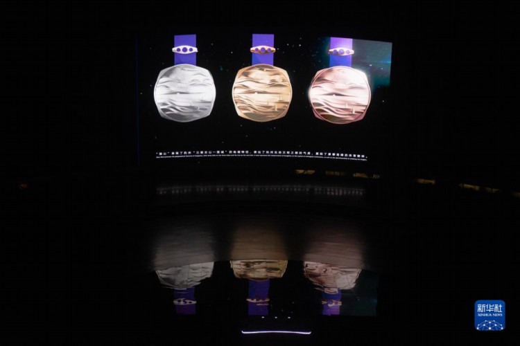 这是6月15日拍摄的杭州亚运会奖牌“湖山”发布现场。 当日,杭州亚运会奖牌“湖山”在杭州亚运会倒计时100天主题活动“等你来 享精彩”晚会上正式发布。 新华社记者 江汉 摄