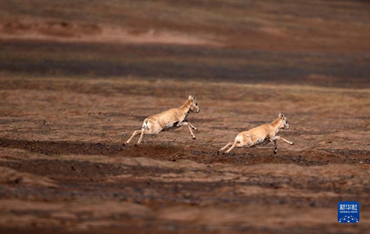 两只藏羚羊在可可西里卓乃湖区域活动(6月17日摄)。