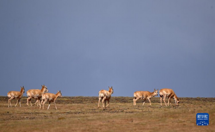 一群藏羚羊在可可西里卓乃湖区域活动(6月18日摄)。